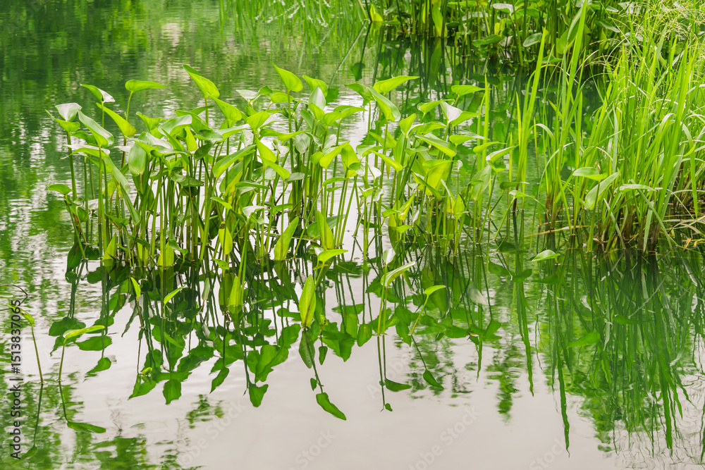Lush aquatic plants grow in and around a still, reflective pond surrounded by dense greenery.