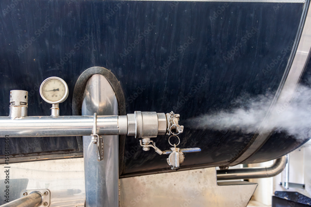 High temperature steam coming out of the vent pipe of a tanker truck during the interior cleaning process.
