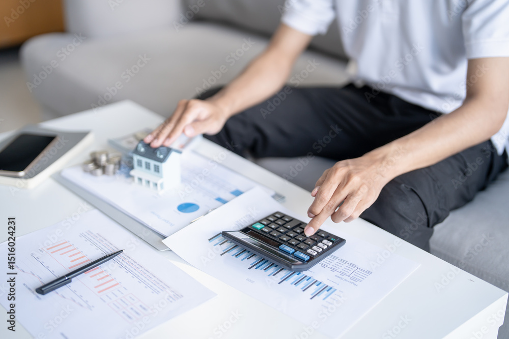 Saving money. Man calculate finances home pay bills taxes savings economy financial at home and saving money stacking coins with calculator
