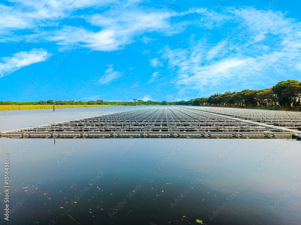Floating solar farm on a lake. Renewable energy, sustainability, power generation