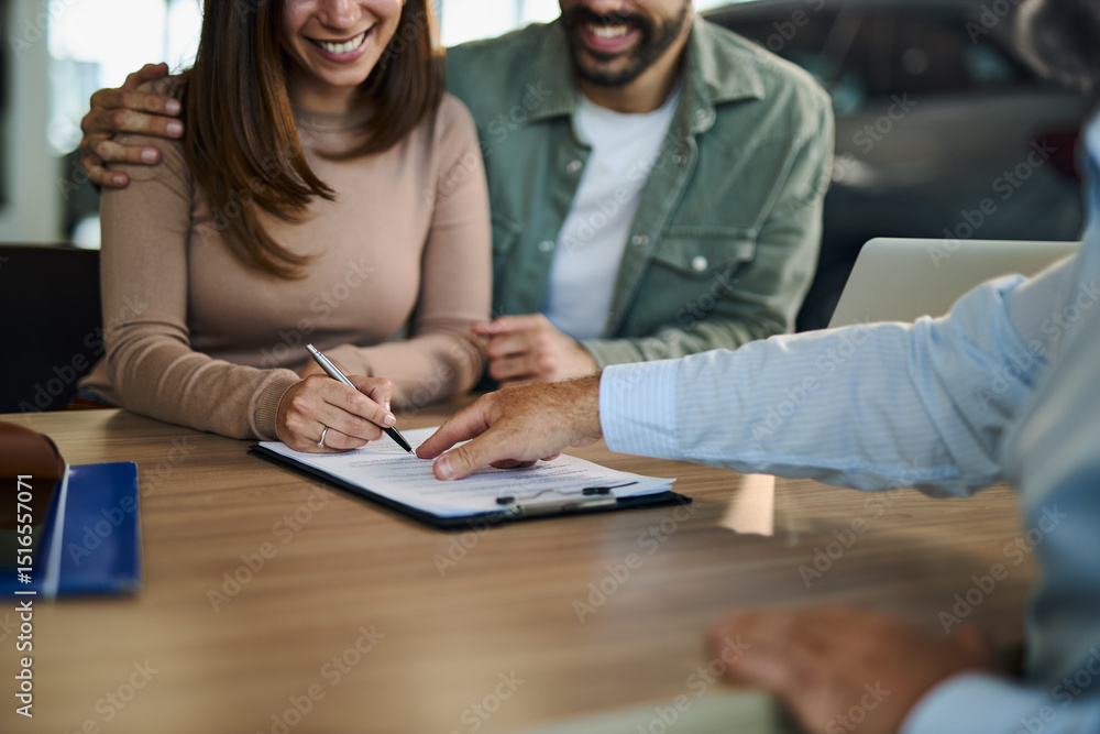 Unrecognizable young couple signing a contract on a meeting with salesperson in a car showroom.