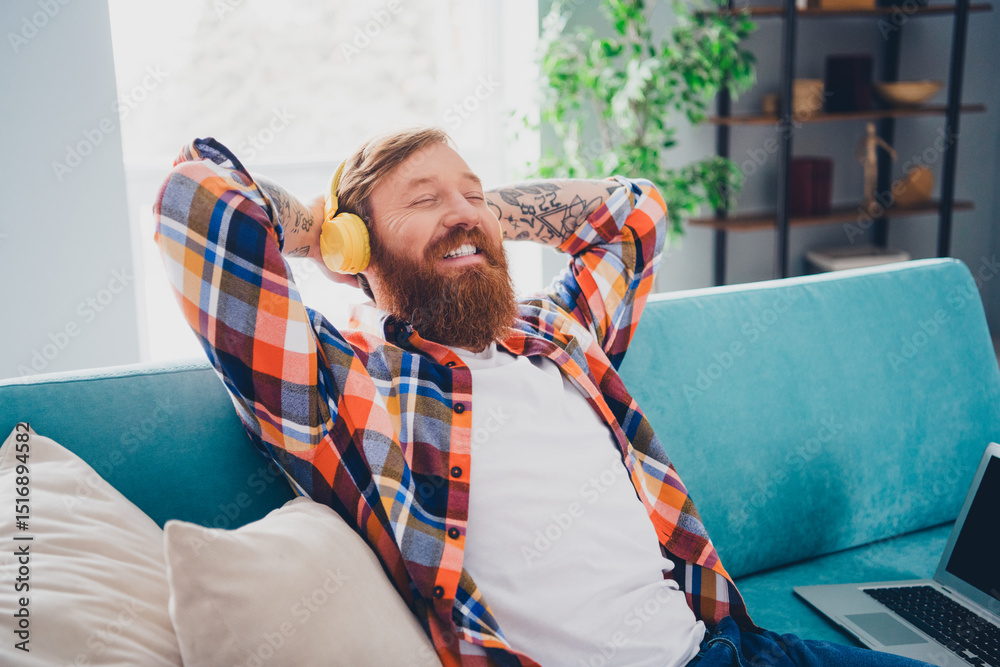 Cheerful bearded man in checkered shirt enjoying music with headphones while relaxing on a cozy sofa in a bright living room
