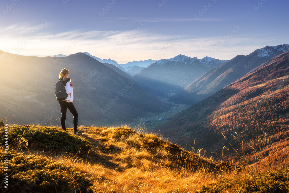 Young woman with backpack standing on grassy mountain ridge with view of valley with high mountain peaks during golden hour sunset in autumn. Hiking in Italy, Livigno. Girl in Alps in fall. Trekking