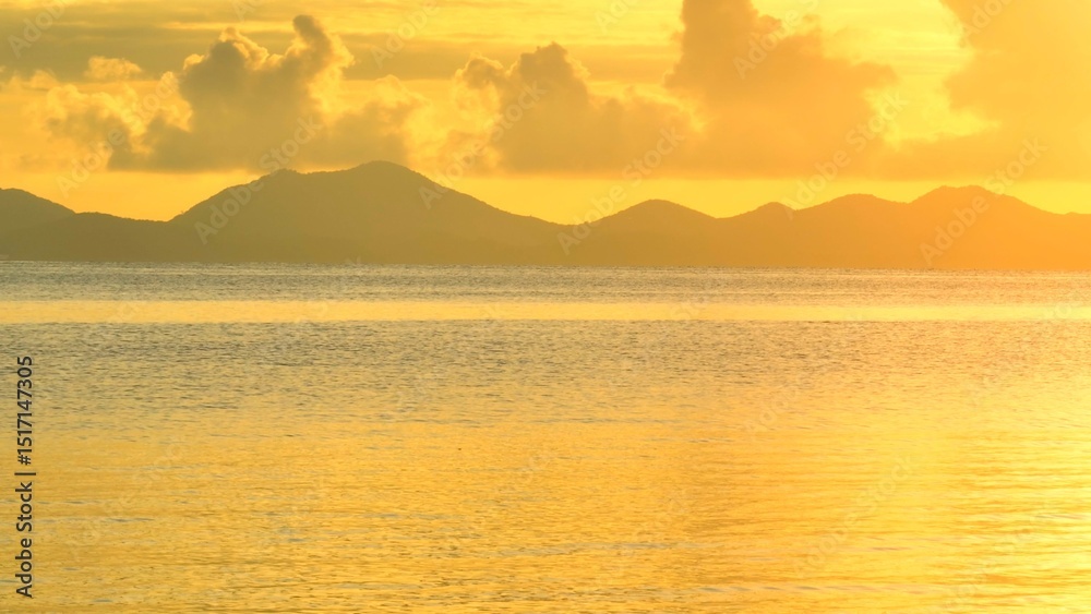 An aerial shot reveals the stunning beauty of a tranquil seascape at sunset, with the golden hues of the sky and mountains gently reflected on the water, evoking a sense of calm and awe. Thailand.