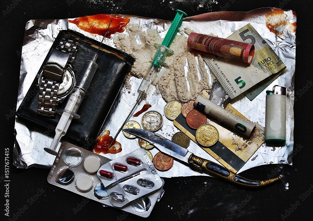 Adicciones de consumo con droga, jeringa, pastillas, dinero, sangre y navaja sobre papel de plata