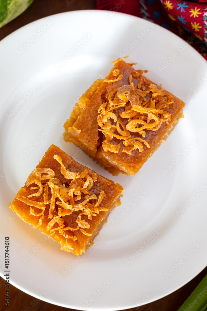 Thai mung bean custard or Thai custard cake on the wooden table.