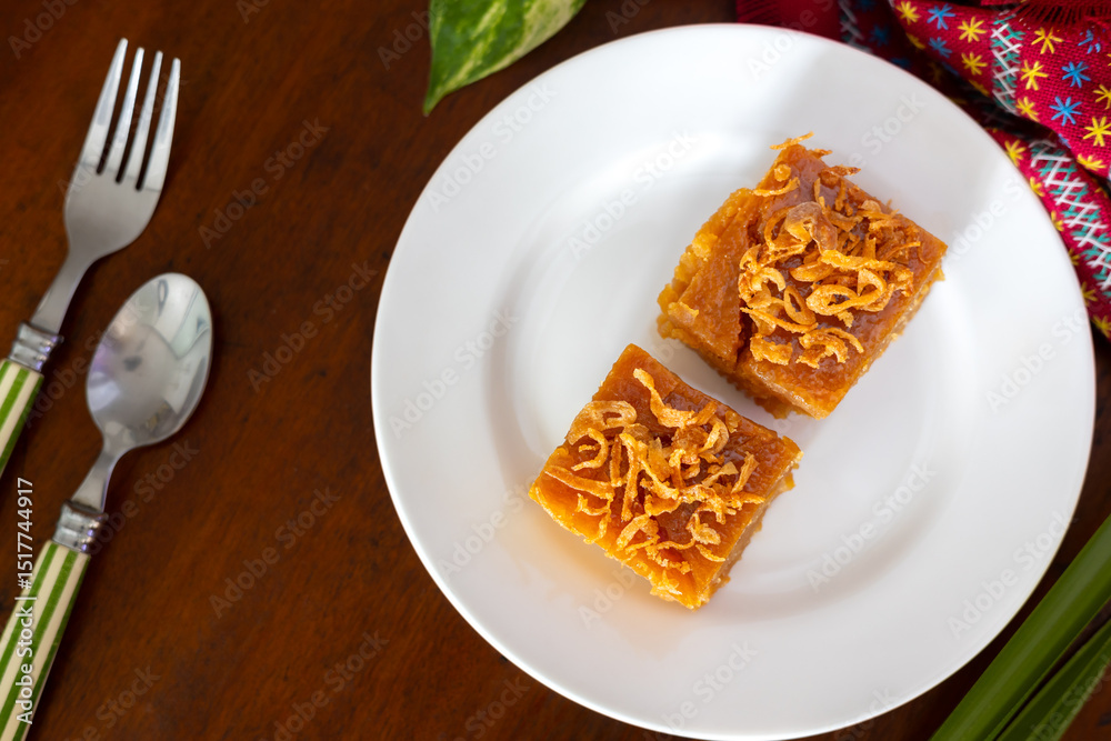 Thai mung bean custard or Thai custard cake on the wooden table.