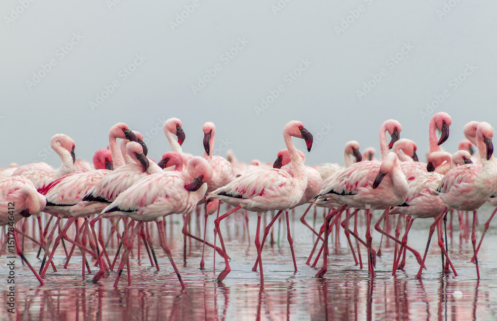Real photo of two pink flamingos standing together by a calm lake under a clear blue sky. A peaceful wildlife scene perfect for nature, travel, and bird-themed projects.