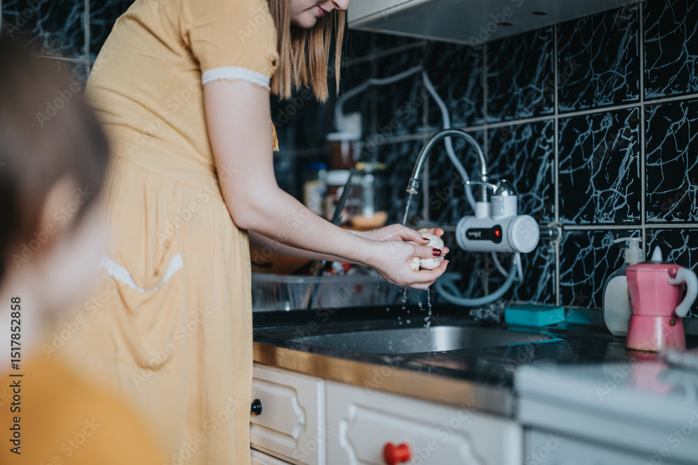 A person standing near a sink in a home kitchen, washing mushrooms under running water while preparing a meal. The modern kitchen setting emphasizes cleanliness and healthy food preparation.
