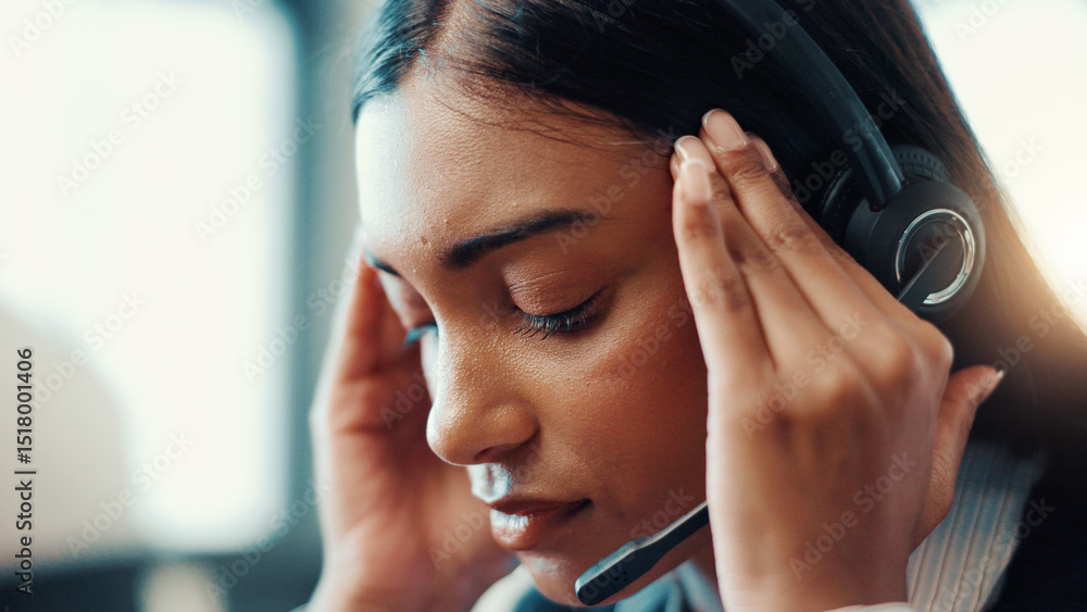 Agent, woman and headache of stress in call center for difficult client, overworked and mistake. Customer service, headset and person with tension migraine for technical issue, 404 error and pressure