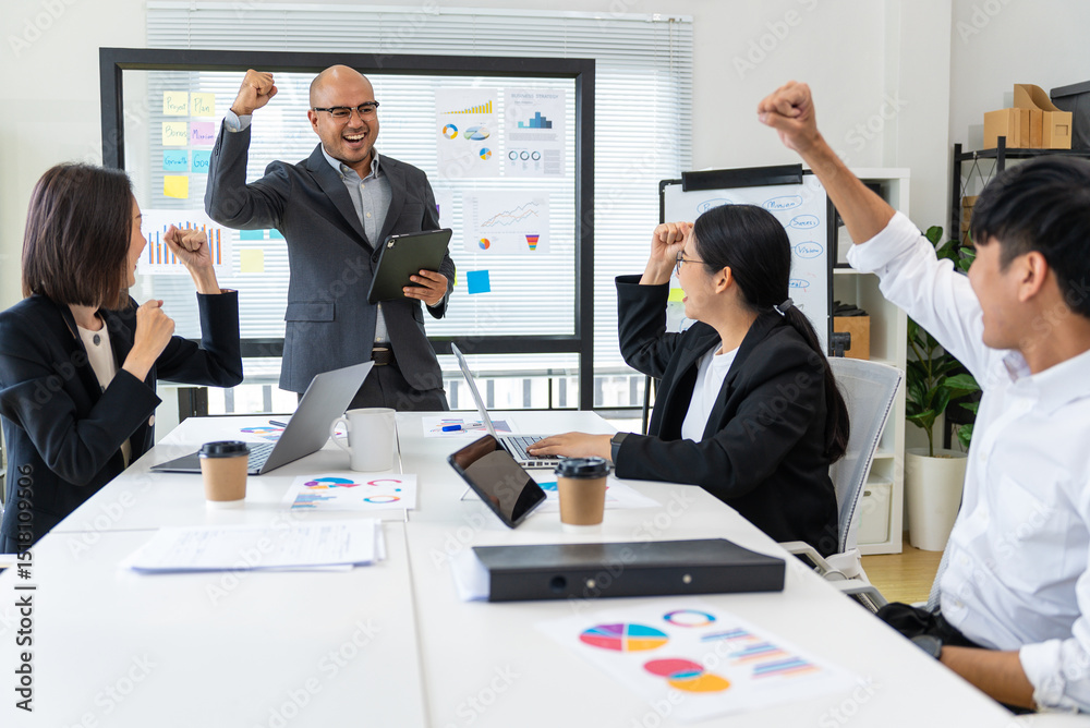 Happy diverse group Asian business team analyzing statistics financial. Group Team of business people meeting conference discussion various topic corporate concept in office.