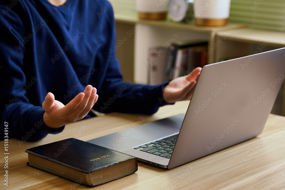 Christian online technology concept. Hands praying of christian with digital computer laptop, Online live church for sunday service. Asian catholic man are reading Holy bible book and online study.