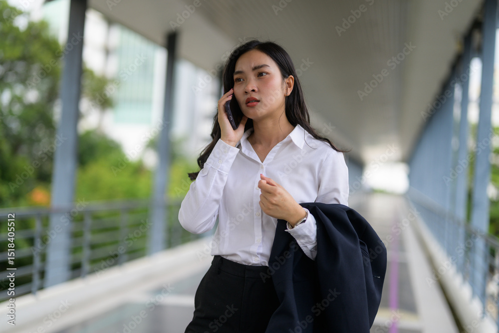 Young businesswoman walking and talking on the phone in a modern city bridge