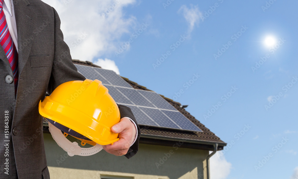 Ingenieur mit Helm vor einem Haus mit Solarzellen