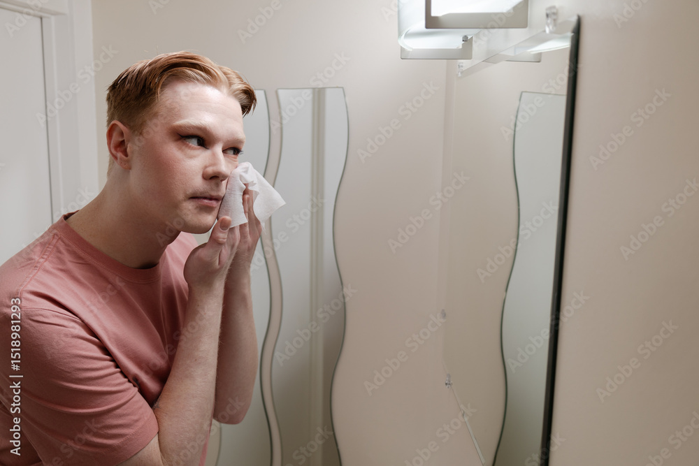 A Medium Shot of a Man Removing Makeup with Wipe in Front of Mirror