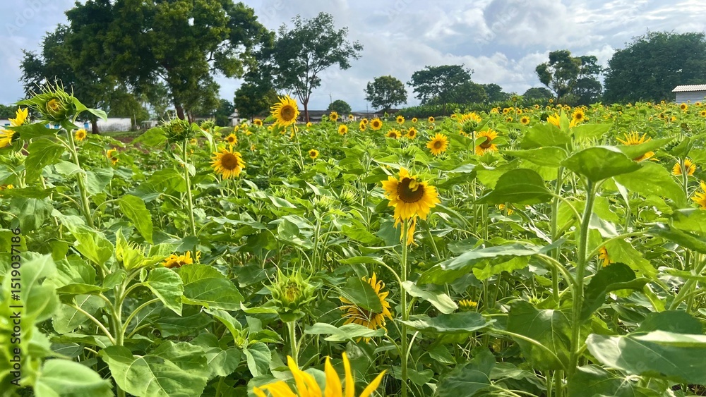 Vibrant close-up of a blooming sunflower in full sunlight with bright yellow petals and green leaves, symbolizing summer, growth, and natural beauty in a garden or field under a clear blue sky
