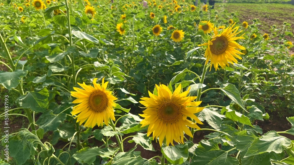 Vibrant close-up of a blooming sunflower in full sunlight with bright yellow petals and green leaves, symbolizing summer, growth, and natural beauty in a garden or field under a clear blue sky