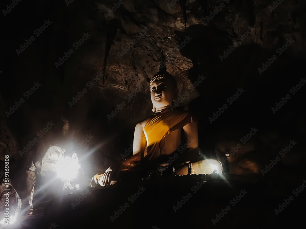 A brightly lit Buddha statue in a meditative pose is prominently featured within a dark cave, with light sources illuminating it from below and around its base.