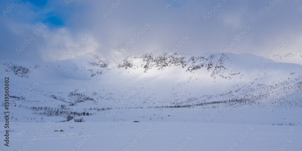 illuminated rocky mountains in the glacier-made valley, snow-covered landscape in solitude, panorama in winter wonderland Norway, with haze and fog on cloudy day, wide white snow