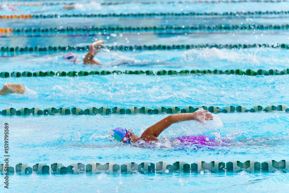 Swimmer child swims backstroke swimming style in a race swimming pool. Water sports and competition, learning to swim classes for children.