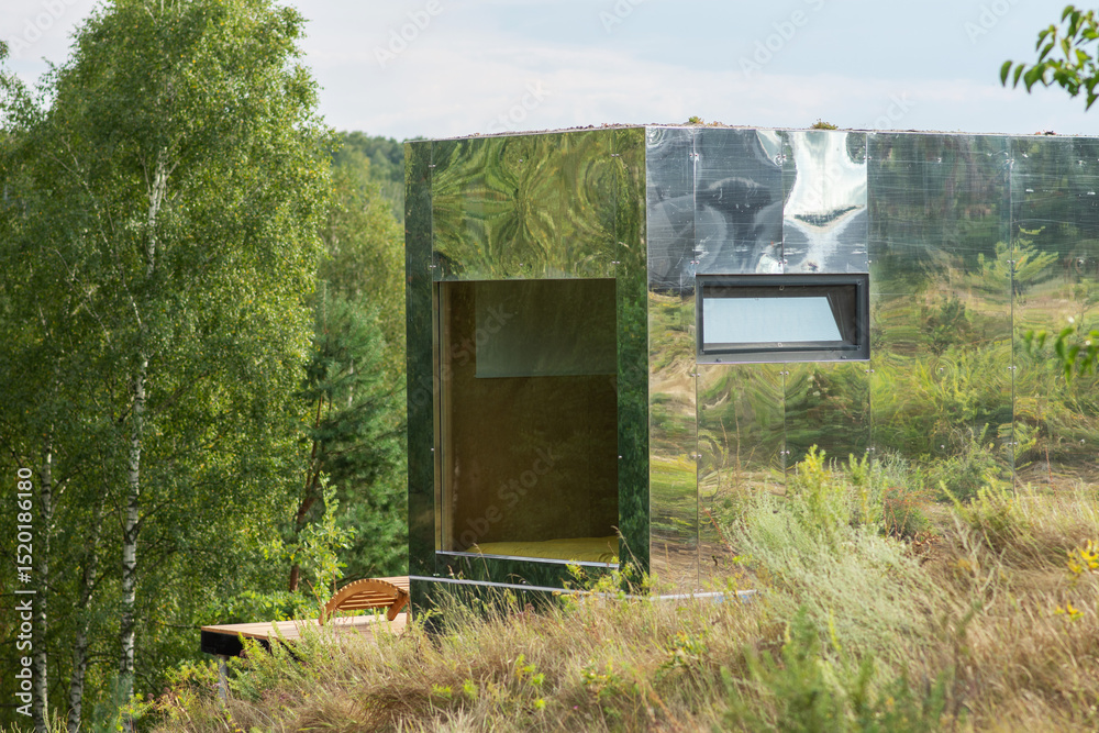 Modular frame mirror house on the background of a summer forest. Mobile ecological space for living and tourism