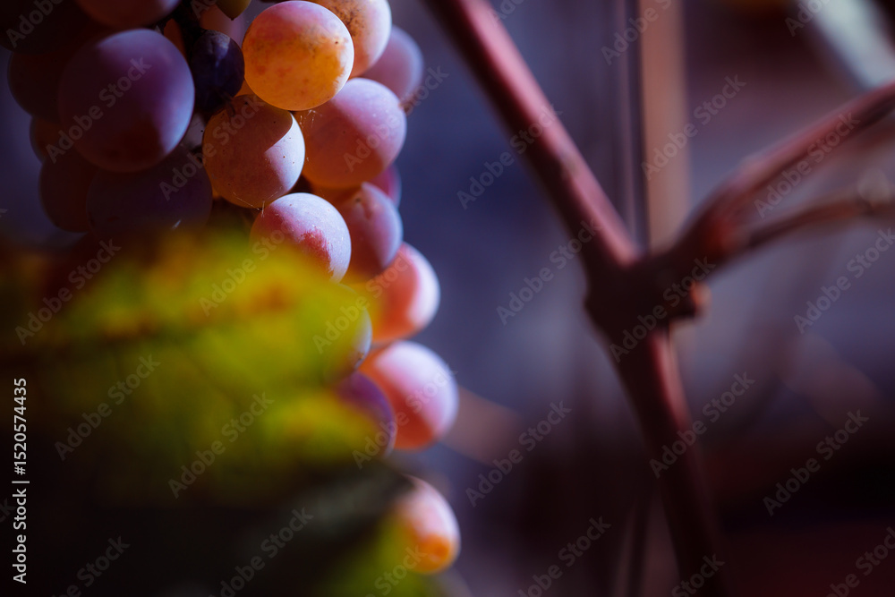 Growing grapes. Grapevine at sunset. Climate for growing wine grapes. Large juicy grone of grapes.