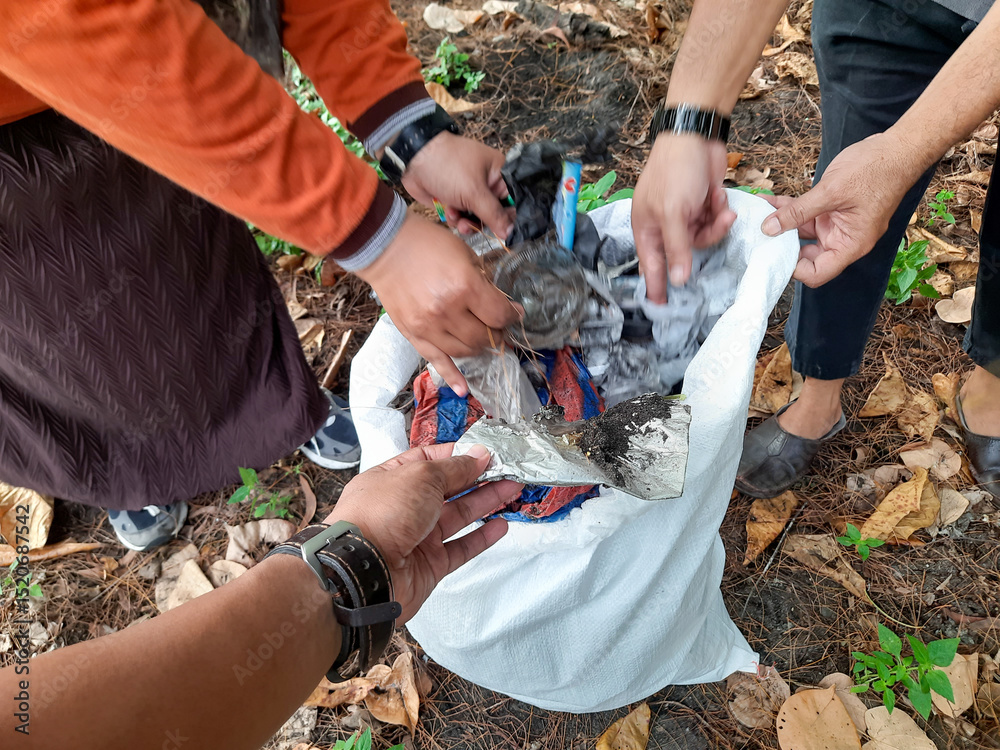 Community Cleanup Collecting Plastic Waste into Sack on Coastal Area