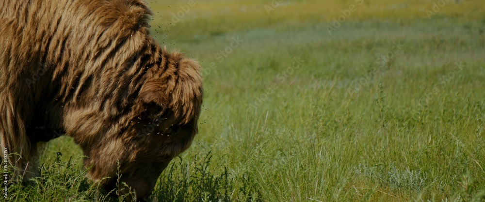 The long hair muskox on the summer lush meadow, happily munching on the juicy green grass beneath his hooves. The long-haired muskox feeds on the juicy green grass beneath its hooves