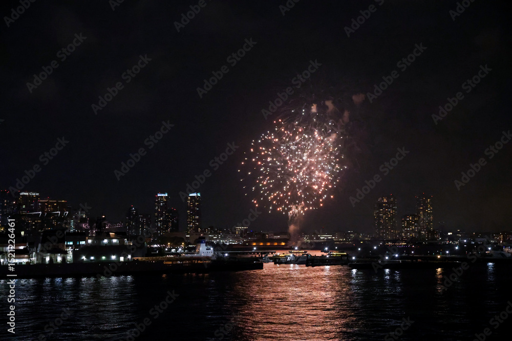 A vibrant firework display lights up the sky above the beautiful Yokohama skyline
