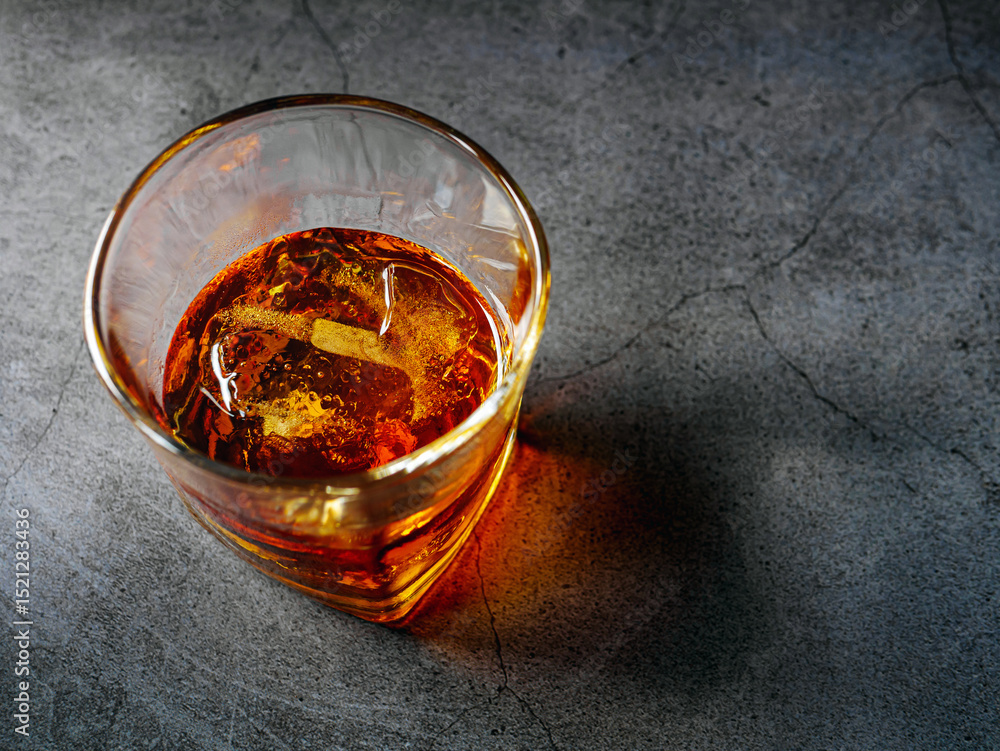 Strong alcohol drink. Whisky in glass with ice, Whisky, bourbon or cognac. Hard strong alcoholic drink