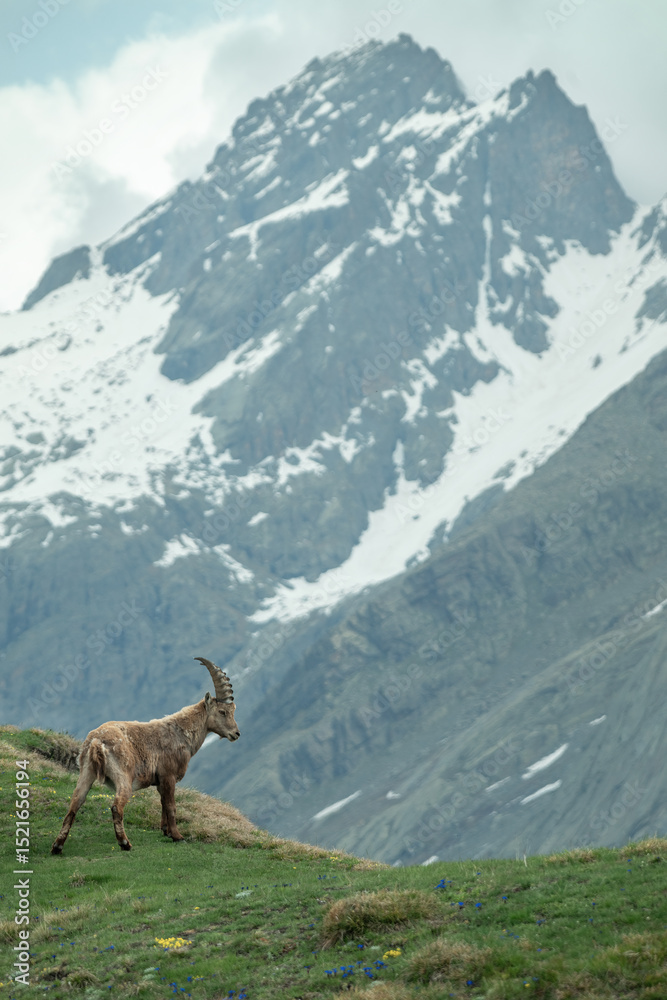 Panoraminc view of a male Alpine ibex standing in a green alpine meadow against snow capped mountains background. European Alps, Monviso Park. June.