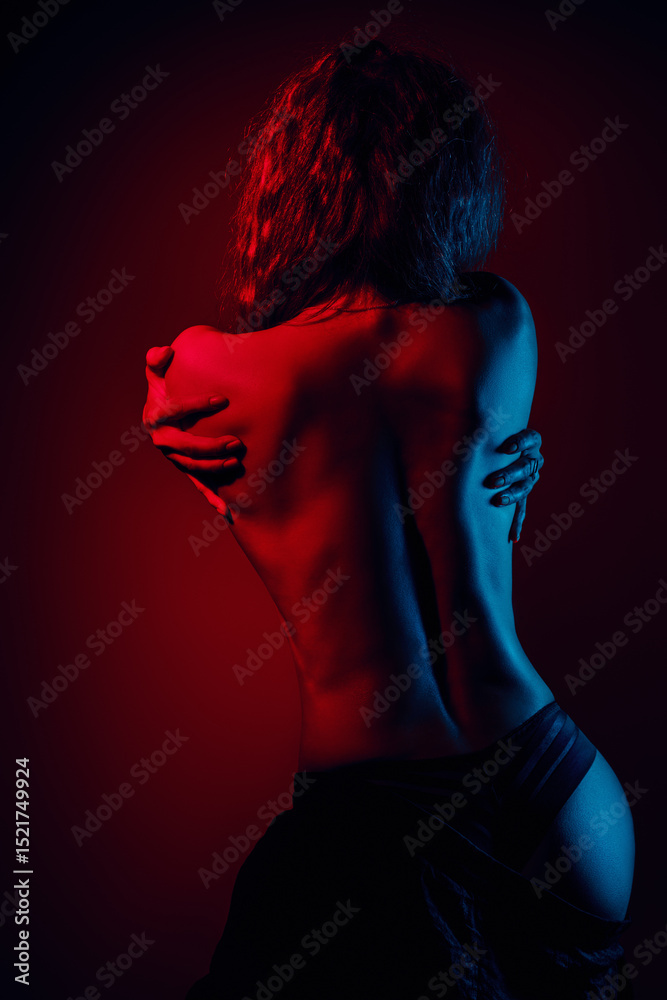 Woman studio posing with bare back, vibrant red and blue lights