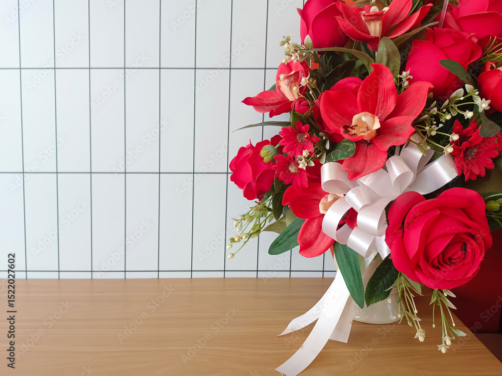 inside right bouquet of red roses and red flowers in a white vase, placed on a wooden table, white tiled wall background, nature, love, fashion, decor, copy space