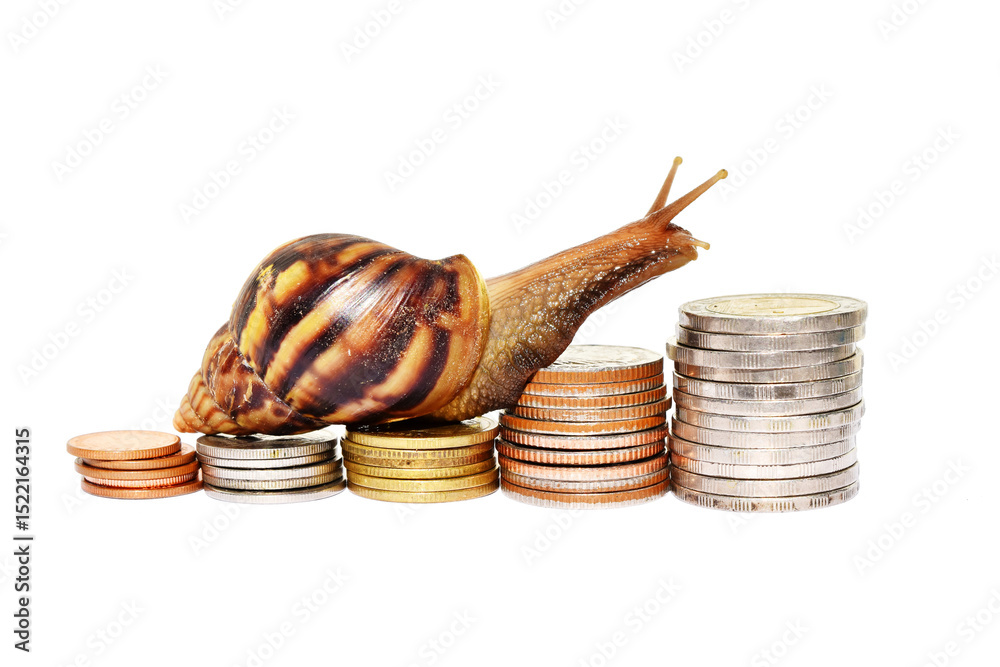 Brown snail climbing the pile of coins on transparent background , Victory and success from patience, Slow economic growth, Development financial and commit business concept
