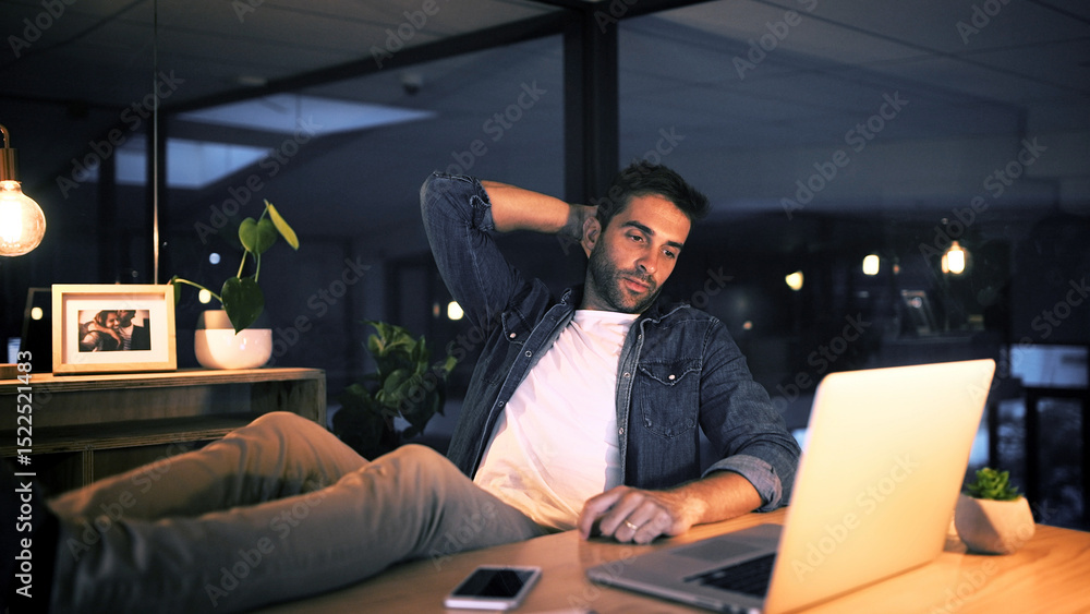 Laptop, relax and businessman with break in office for night research, copywriting deadline or project. Bored worker, tired and editor with wait, low energy or overtime for news article online