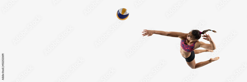 Banner. Aerial view of female athlete reaching to spike volleyball in air against white studio background with copy space to insert text. Concept of sport agility, jump precision, and intense movement