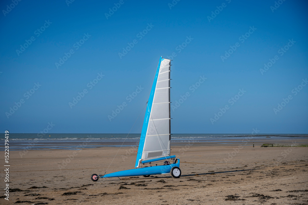 Asnelles-Sur-Mer, France - 05 16 2025: View of a white and blue competition land yacht, a wheeled vehicle propelled by a sail along the beach between sand and sea