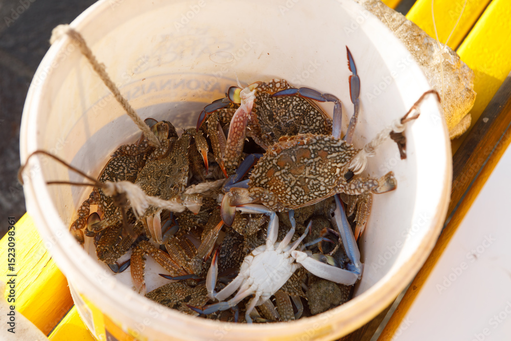 Freshly Caught Blue Crabs in a Fisherman's Bucket