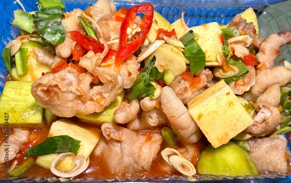 Chan Ga Xa Tac Delicious steamed chicken feet with green mango and sour fruit lemongrass chili herb fish sauce seasoning Vietnamese street food popular Asian cuisine snack healthy food