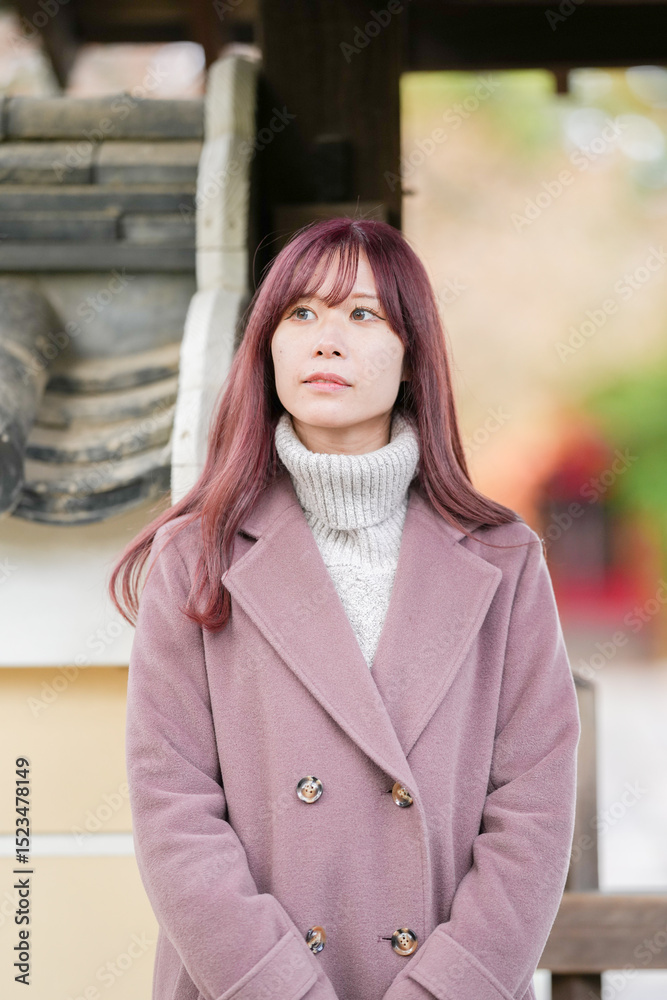On a chilly December morning, a Japanese woman in her early twenties with long pink hair and a pink trench coat stands at a traditional wooden gate, quietly admiring its elegant and historic beauty.