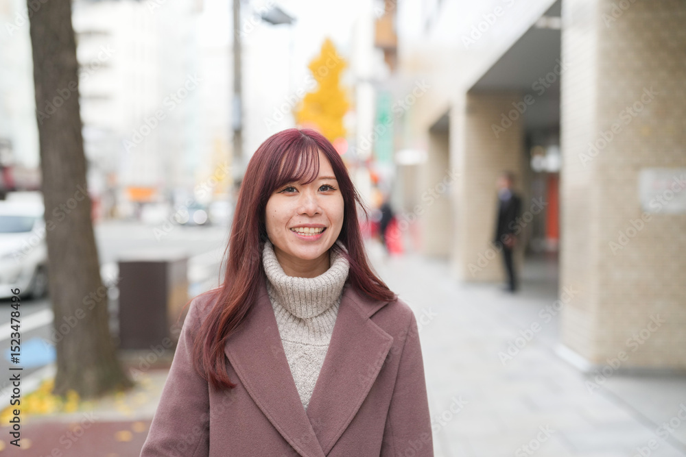 On a cold December morning, a Japanese woman in her early twenties with long pink hair, wearing a stylish pink trench coat, walks gracefully through a beautifully clean, calm, and modern city street.