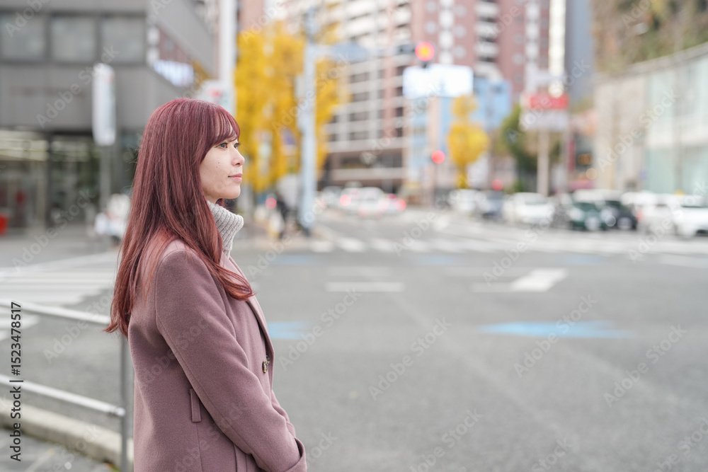 On a cold December morning, a Japanese woman in her early twenties with long pink hair, wearing a stylish pink trench coat, walks gracefully through a beautifully clean, calm, and modern city street.