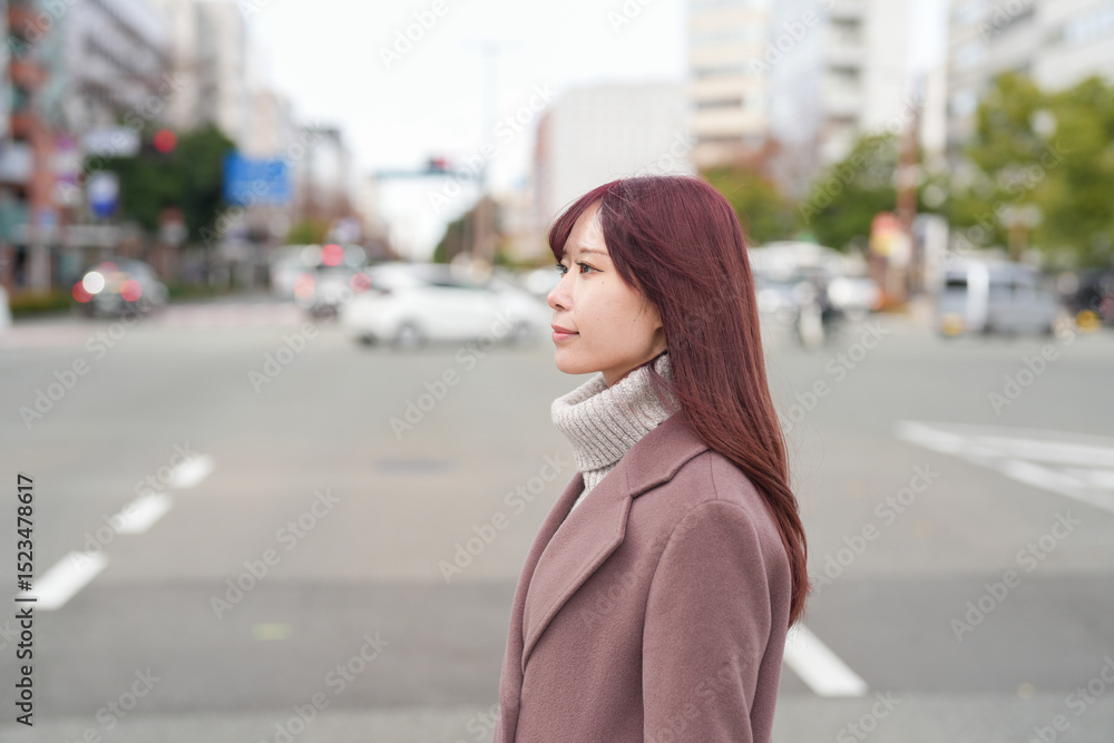 On a cold December morning, a Japanese woman in her early twenties with long pink hair, wearing a stylish pink trench coat, walks gracefully through a beautifully clean, calm, and modern city street.
