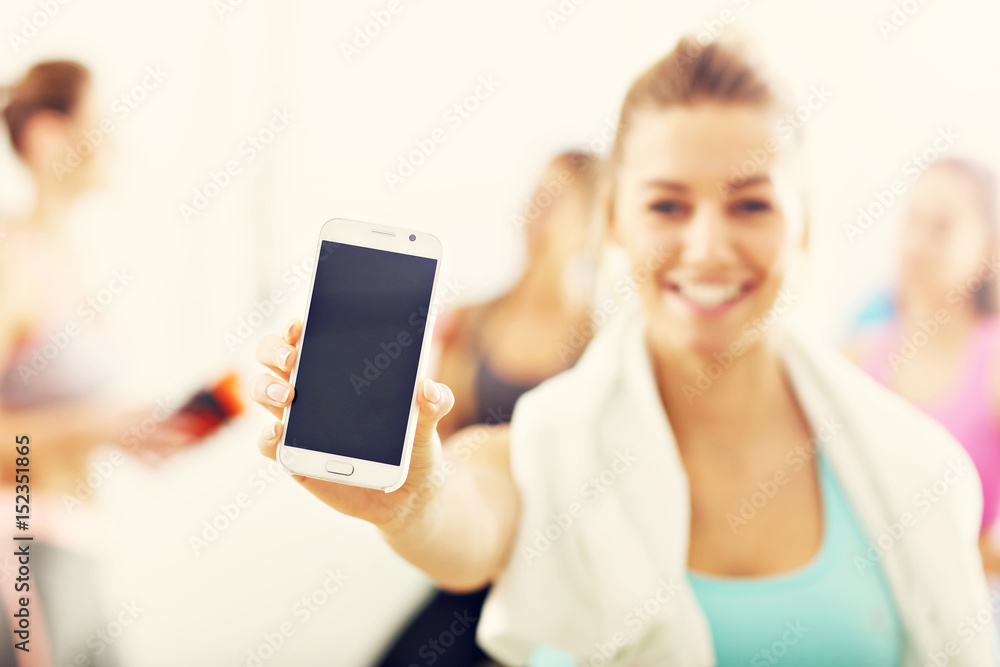 Portrait of beautiful mature woman with smartphone smiling in health club