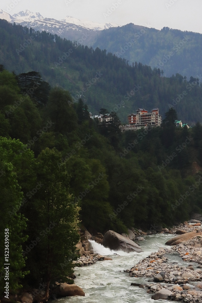 foggy and cloudy lush green forest and himalaya mountain foothills view from manali hill station in kullu district, himachal pradesh, india