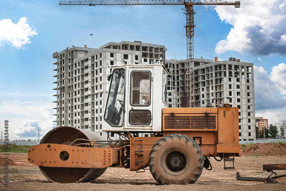 Heavy roller machinery working on a construction site with rising buildings on a cloudy day