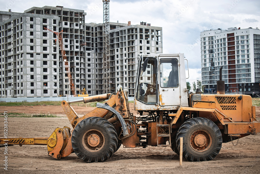Construction site with heavy machinery working on new building developments in urban area