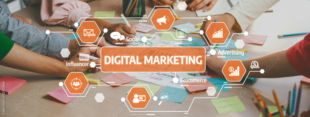 A vibrant digital marketing scene showing diverse hands collaborating on innovative strategy development using colorful notes and modern technology icons for effective planning. Amity