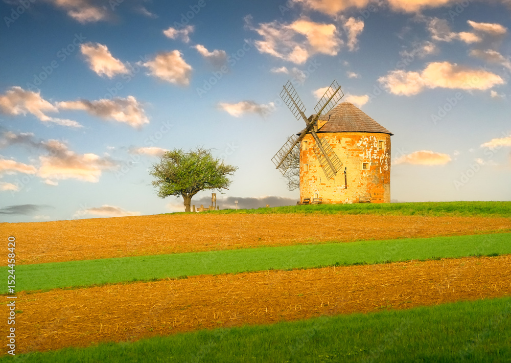 Historic windmill stands tall on a green field under a clear sky at sunset