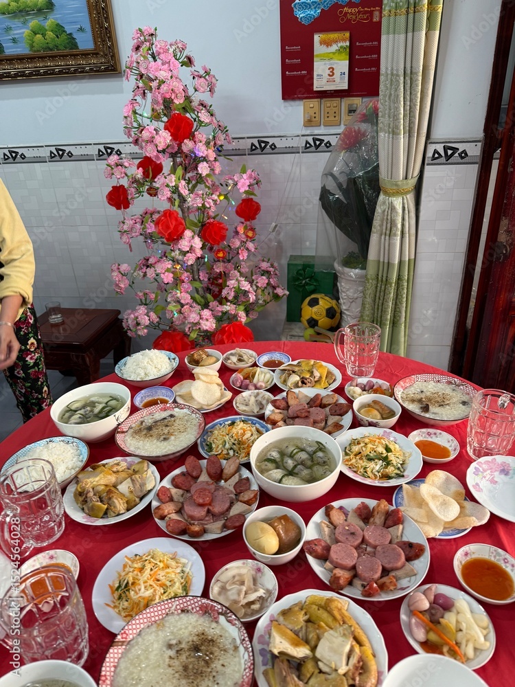Vietnamese New Year Tet table full of asian food celebration red background party gathering family various dishes traditional food asian cuisine delicious meal together